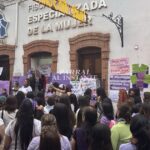 Contingente del 8M protesta con pancartas y consignas frente a la FEM
